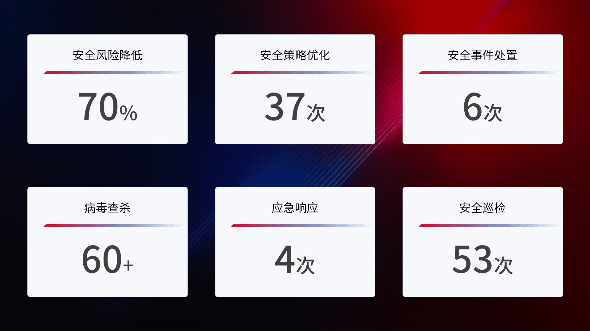 提供全面的安全事件报告体系,,,包括处置报告、、周报、、、、季度和年度总结,,,,结合持续监控,,,帮助客户深入了解网络安全状况。。。。