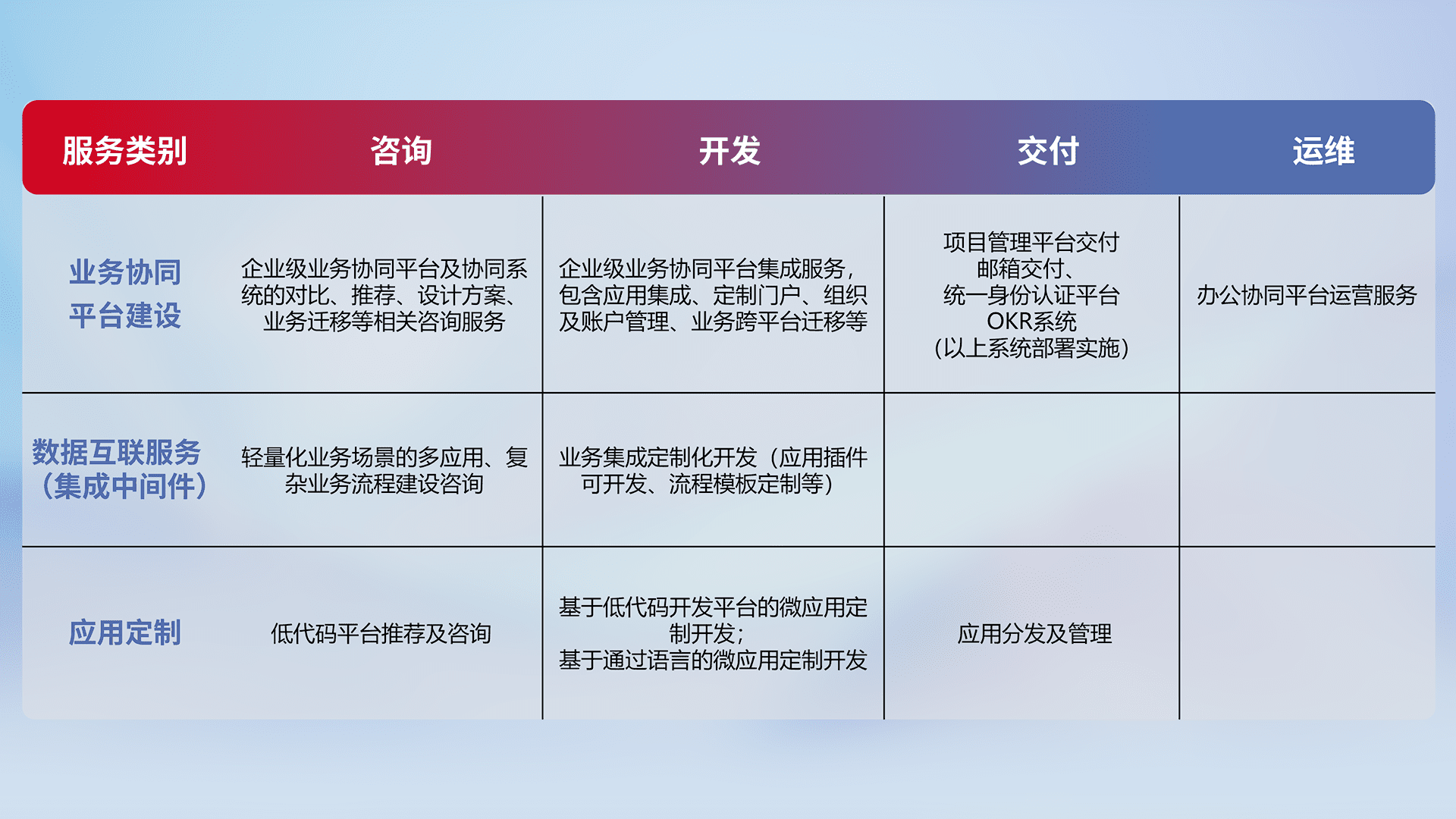 针对钉钉、、企微、、、IDaas等平台级产品提供产品的规划、、、、方案、、、交付、、、定制化开发等服务,,实现如统一协同办公、、、、智能客户服务、、、、混合会议管理、、、智能数据查询、、、等业务场景,,,实现数字化转型。。