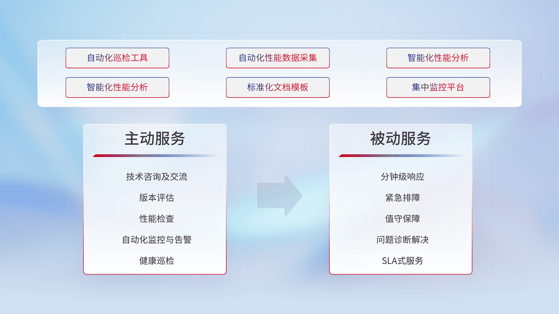 智能化工具和标准化文档,,,,保障服务质量,,,,提供主动服务(包含技术咨询、、、、版本评估、、性能检查、、、、自动化监控与告警、、、、健康巡检)和被动服务包含(分钟级响应、、、紧急排障、、、值守保障、、问题诊断解决、、SLA服务)。。。。